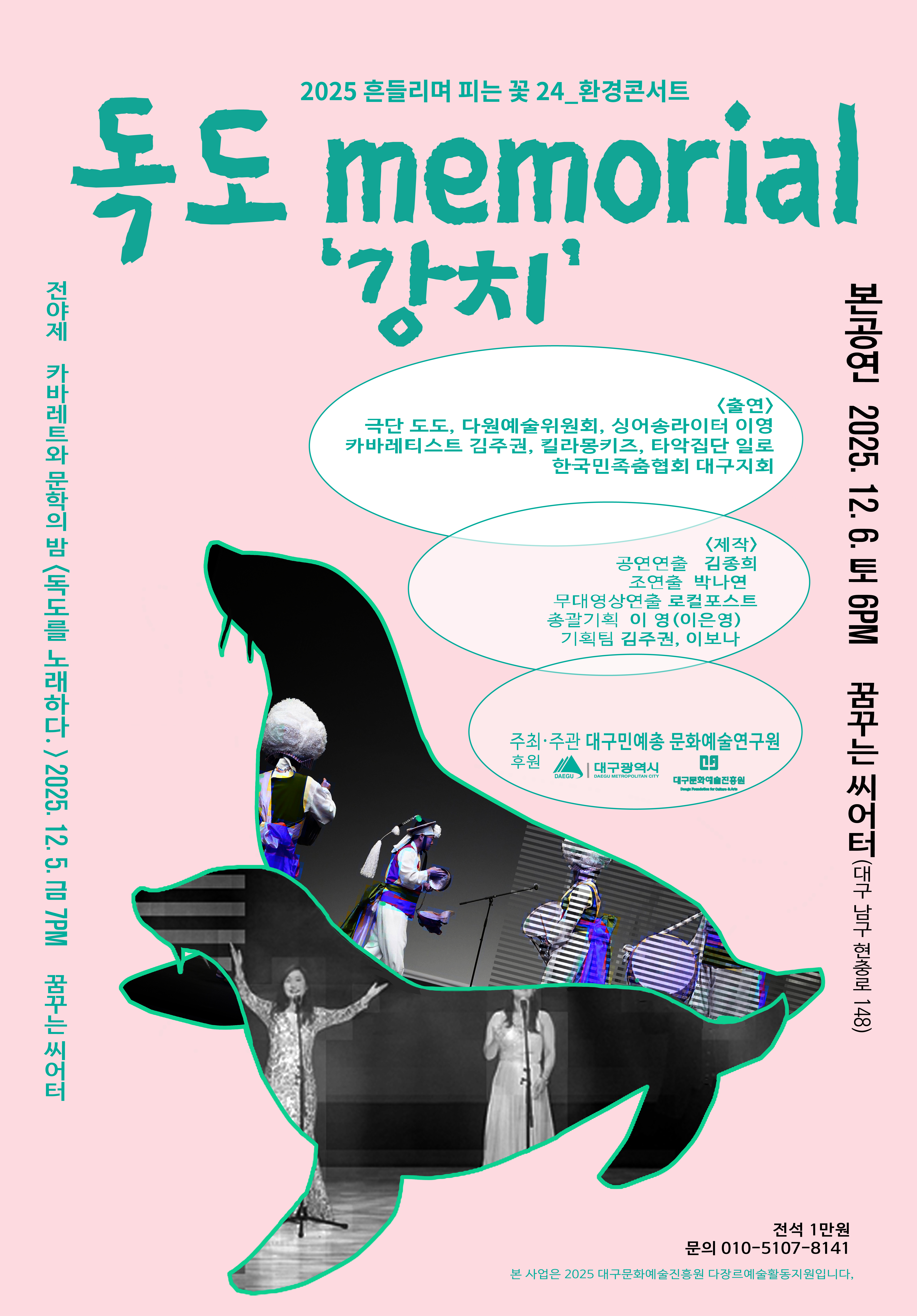 - 2025 흔들리며 피는 꽃 24_환경콘서트 〈독도 memorial: 강치〉는 독도와 그곳에 서식했던 우리 고유 동물 ‘강치를 중심으로, 역사적 진실과 환경적 현실을 예술로 풀어낸 복합장르 공연입니다.